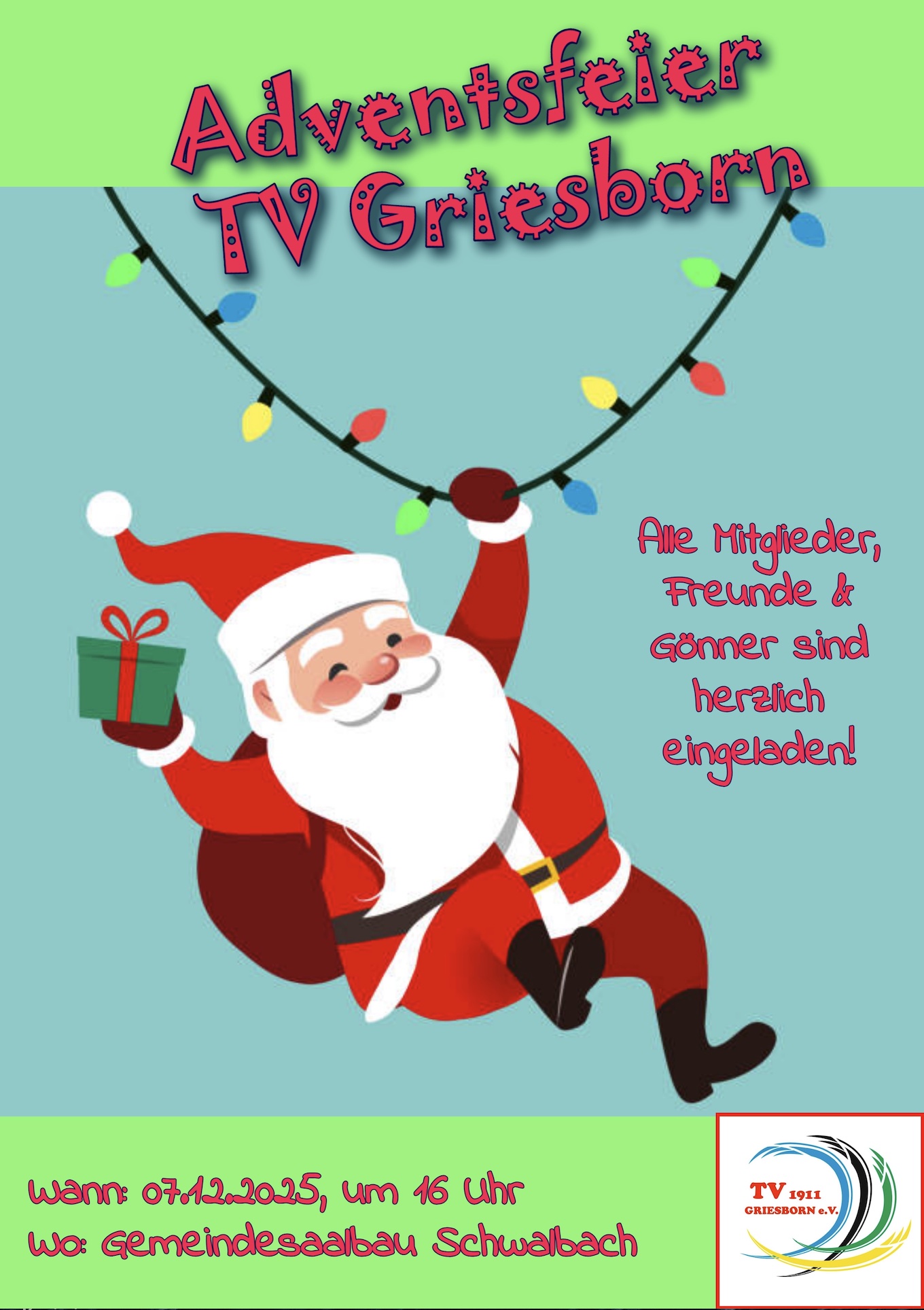 Der TV Griesborn lädt alle Mitglieder, Freunde und Gönner herzlich zur diesjährigen Adventsfeier ein. Los geht’s am Sonntag, den 07. Dezember um 16:00 Uhr im Gemeindesaalbau in Schwalbach. Für Kaffee und Kuchen ist gesorgt, und der Nikolaus hat sich auch angekündigt! Wir freuen uns auf euch!