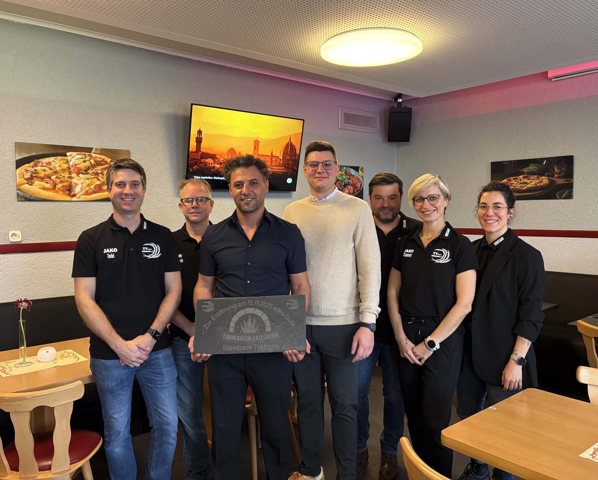 Seit Samstag, den 15. November ist das Turnerheim wieder geöffnet. Das neue Team um Pächter Celal Nas bietet italienische Küche an. Pizza, Pasta, Salate und Schnitzel stehen auf der Speisekarte. Zum Start gab es einen Sektempfang und verschiedene Leckereien aus der Küche zum Probieren. Der Vorstand des TV Griesborn freut sich mit Celal Nas einen sympathischen und engagierten Gastronomen gefunden zu haben. Es gelten folgende Öffnungszeiten: täglich von 11:00 – 23:00 Uhr inklusive Mittagstisch. Ruhetag: Donnerstag.