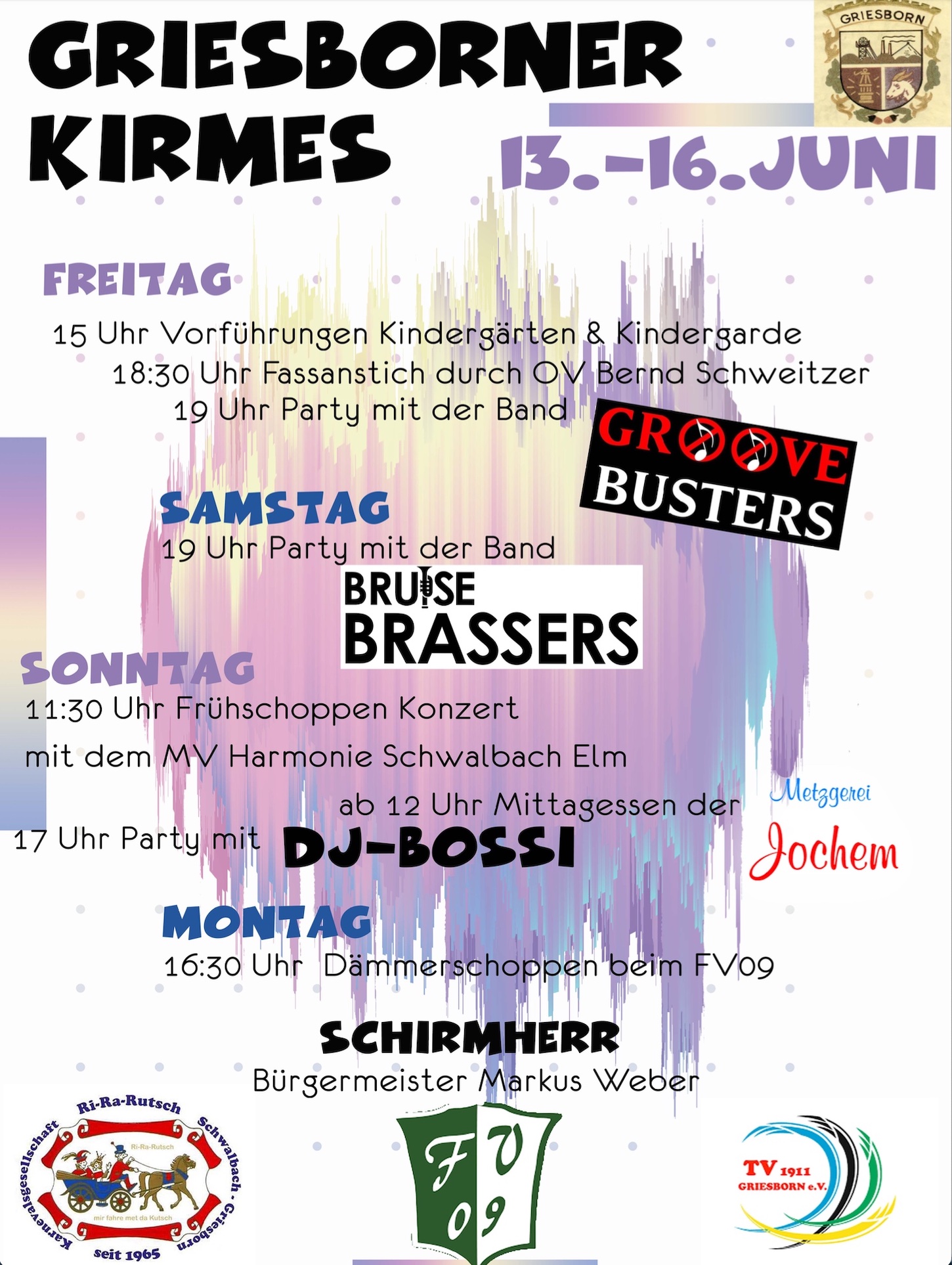 Vom 13. bis 16. Juni findet wieder die Griesborner Kirmes statt. Die Besucher erwartet ein super Programm: 2 Bands (Groovebusters, Bruise Brassers), DJ Ralf Bossmann und viele Schausteller. Der TV Griesborn ist mit einem Weinstand (diesmal mit ausgewählten Köstlichkeiten von Pinard de Picard) und dem traditionellen Flammkuchen-/Pizzastand vertreten. Hierfür brauchen wir tatkräftige Unterstützung. Wir würden uns sehr freuen, wenn sich viele Helferinnen und Helfer für eine Schicht eintragen, damit die Kirw auch für unseren Verein ein Erfolg wird.